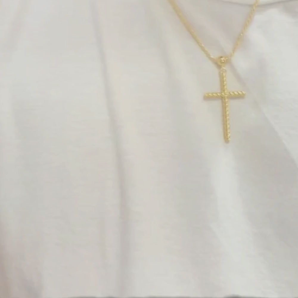 Pendant: Rope-style cross design with polished finish for understated elegance.